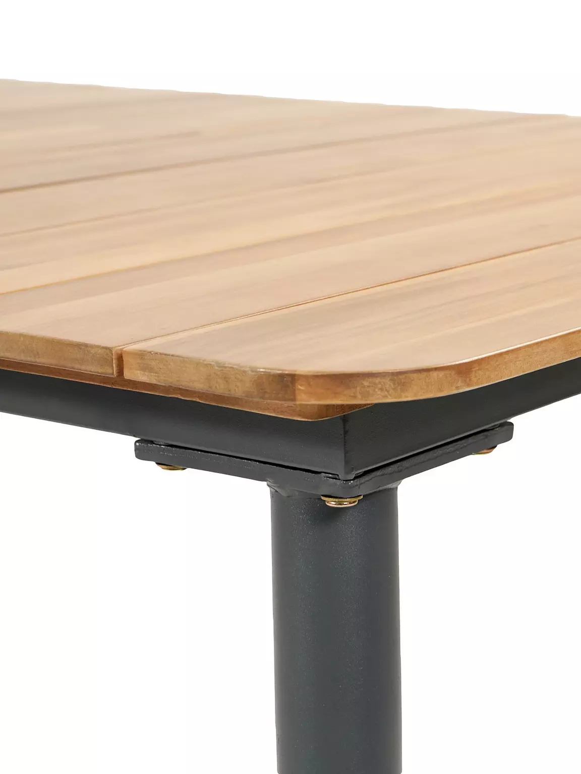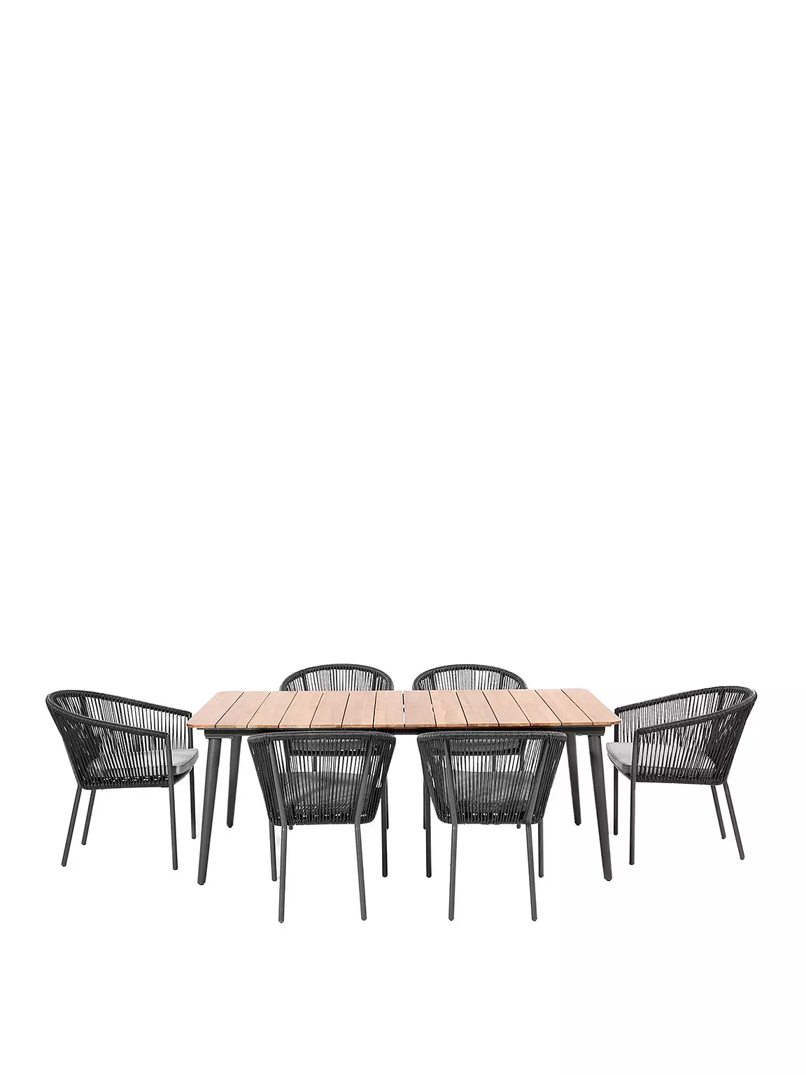 The wide, slatted acacia wood table has a stunning Light Teak hue and is surrounded by 6 sleek dining chairs. The frame is a tonal Anthracite powder-coated metal, making it sturdy and oh-so-chic. There is also a weatherproof polyrope that laughs in the face of water, maintaining its taut structure without sagging. Oh, and we should probably also mention those beautiful Light Linen Stone Grey fabric cushions!